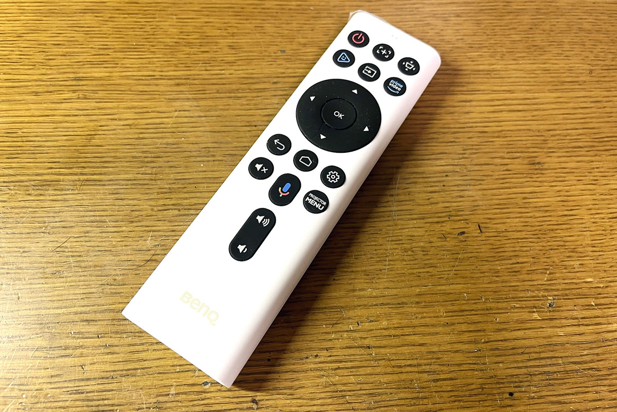 リモコンは、白と黒を基調としたデザインです。ボタンの多くはイラストで表記されており、わかりやすく、メニューの中に組み込まれている台形補正やフォーカスボタンも露出されているので、初心者でも操作に迷うことはないでしょう。
