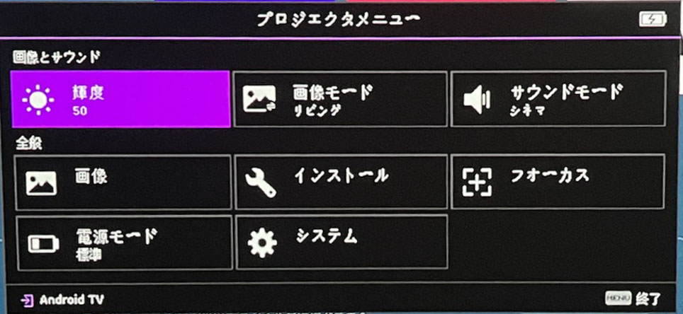 プロジェクターメニューは「画像とサウンド」「全般」の2つに分かれています。「画像とサウンド」では輝度、画像モード、サウンドモードといった調整ができます。「全般」では画像、インストール、フォーカス、電源モード、システムといった設定が可能です。