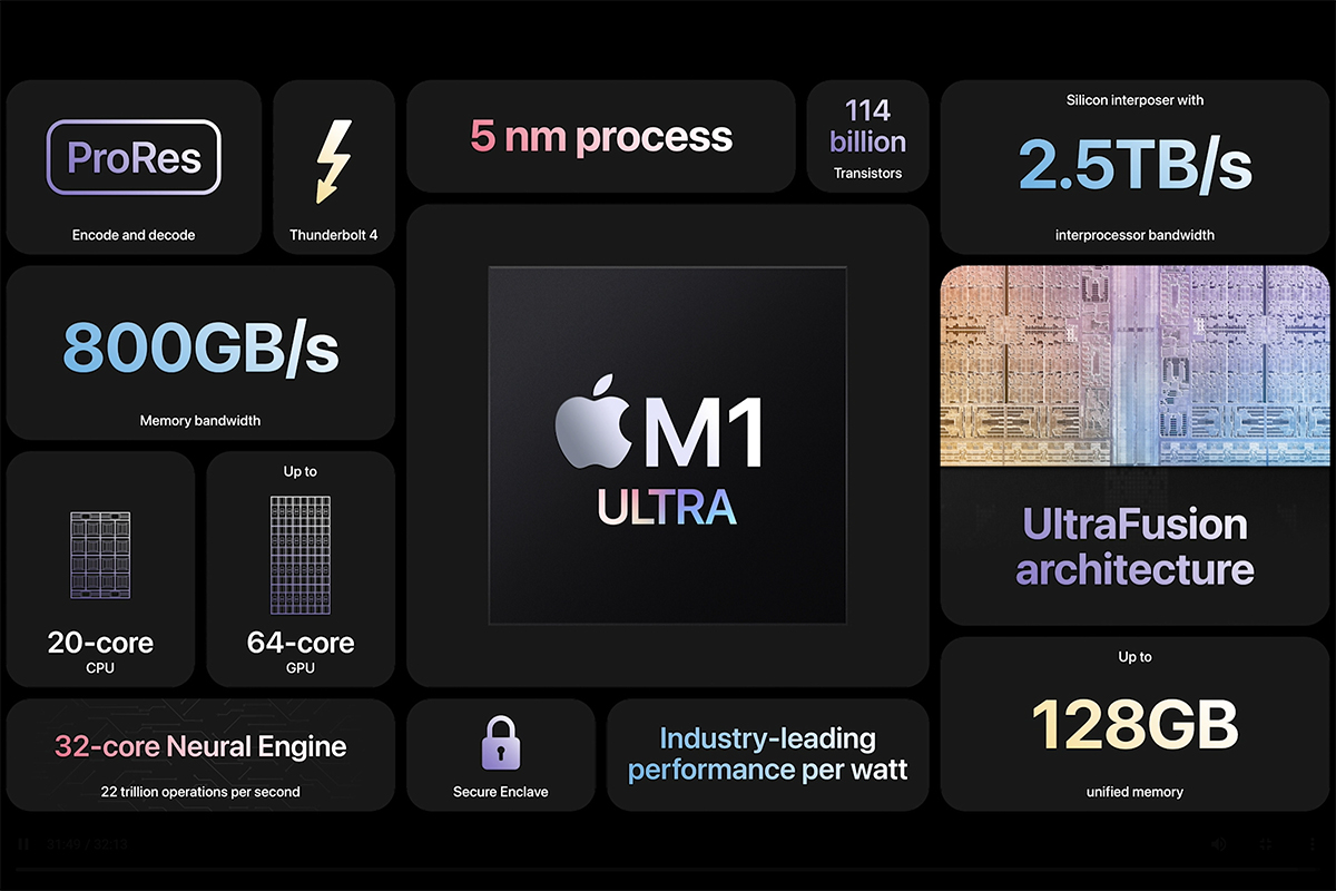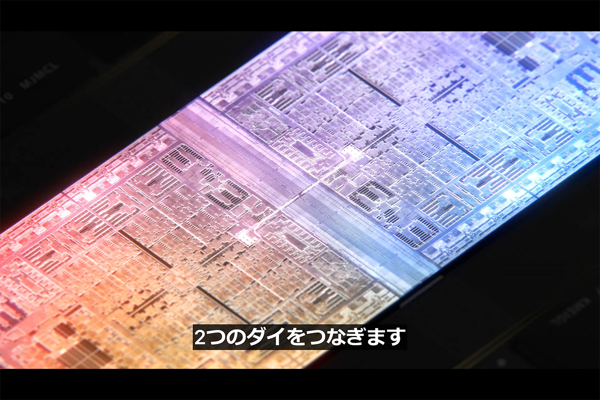 M1 Ultraは、アップルが「パーソナルコンピュータ史上、最もパワフル」と説明するチップで、2つのM1 Maxをつなぎ合わせる「UltraFusion」という方式で製造されています。