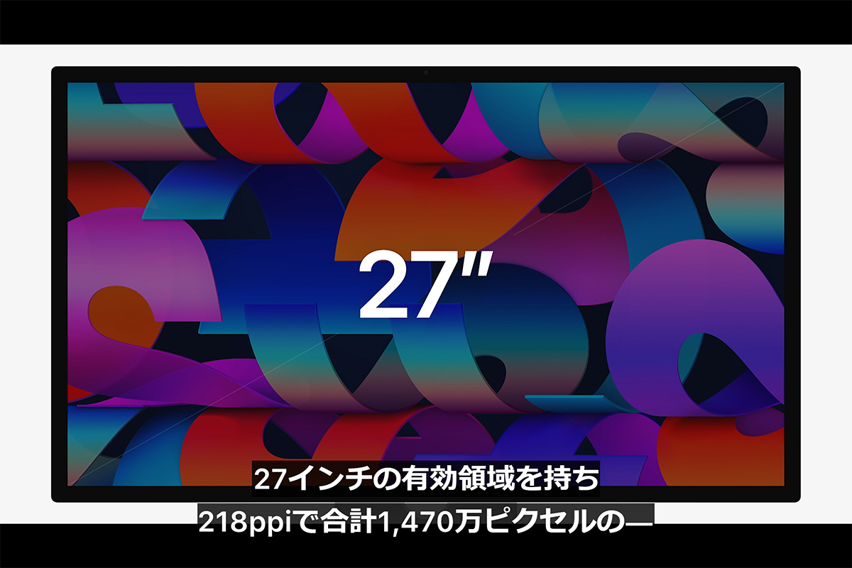 またMac Studioと合わせて、27インチディスプレイ「Studio Display」も発表されました。5120×2880ピクセルの5K仕様で、ディスプレイでありながらA13 Bionicチップを搭載。6基のスピーカーユニットによる空間オーディオの再生や、センターフレームに対応する12メガピクセルの超広角カメラ、「Hey Siri」の呼びかけでのSiriの起動、「スタジオ品質」をうたうマイクアレイの搭載といった機能を持ちます。