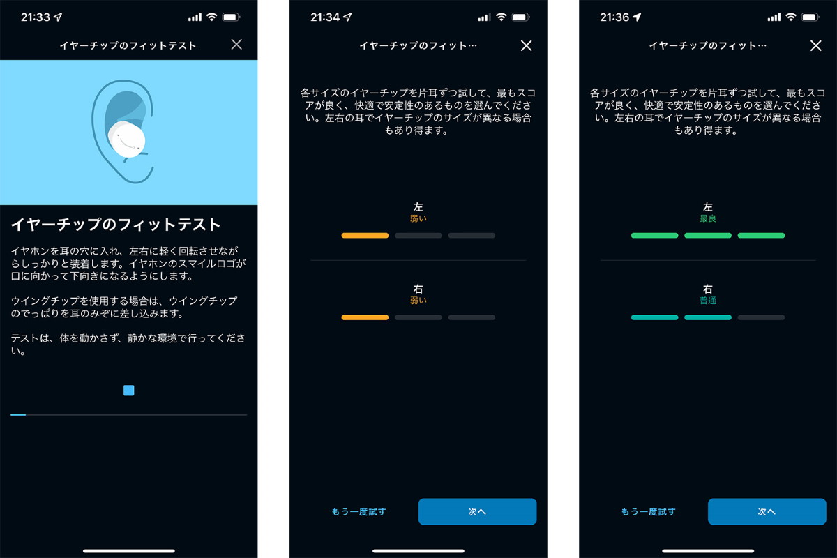 イヤホンの形状はとてもオーソドックスです。筆者は問題なく装着できましたが、耳穴の小さい方はハウジングの内側が耳に少し当たる感覚があるかもしれません。イヤーチップのサイズを合わせたり、ウィングチップで装着感を調整するとよいでしょう。Alexaアプリには、ユーザーの耳に合ったイヤーチップ等を付けて最適なフィットが得られているかを確認できるフィットテストツールも用意されています。装着に不安のある方はそちらを活用しましょう。