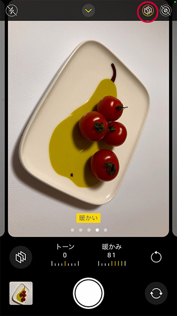 ただ、第3世代のiPhone SEを使って室内で撮影した料理の写真は、ホンモノよりも少し色合いが大人しい感じもします。そんなときには撮影前に写真の色合い、暖かみを調整できる新機能「フォトグラフスタイル」を併用すると、より美味しそうな料理の写真を撮れるでしょう。