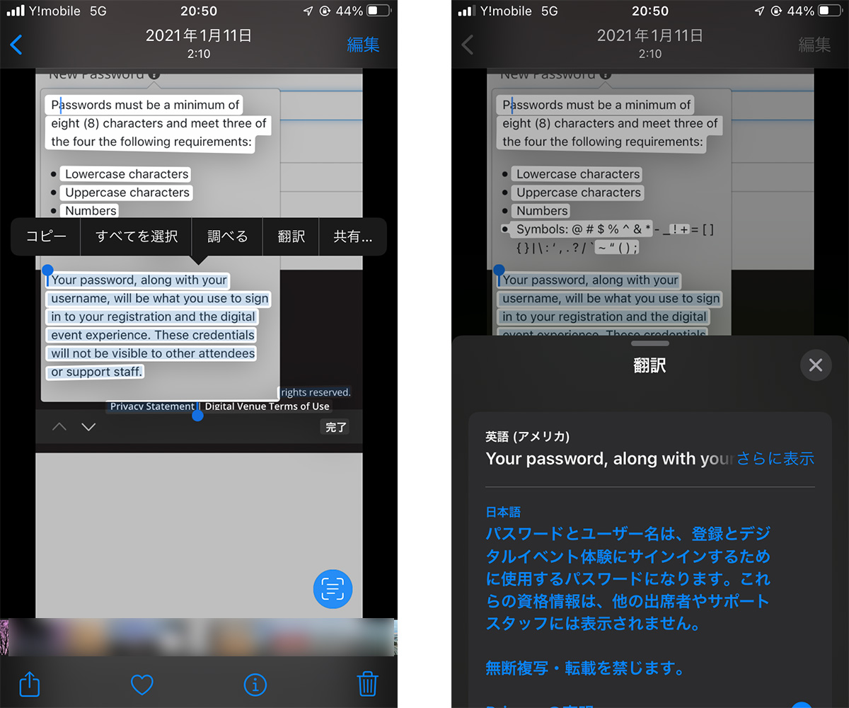 ↑写真アプリから「テキスト認識表示」を利用。外国語の資料の翻訳などにも役立ちます