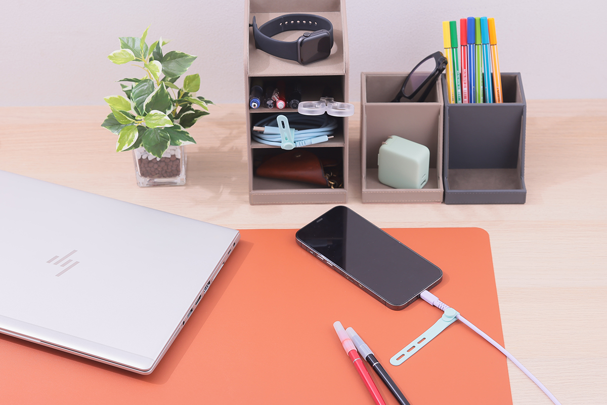 「デスクマット」と「デスクオーガナイザー」は、デジタル機器ではない、純粋な卓上製品です。デスクマットは卓上に敷いて机の傷を防止できます。また、デスクマット上でマウスの操作も可能。PCで作業する机に置いても十分に活躍してくれます。