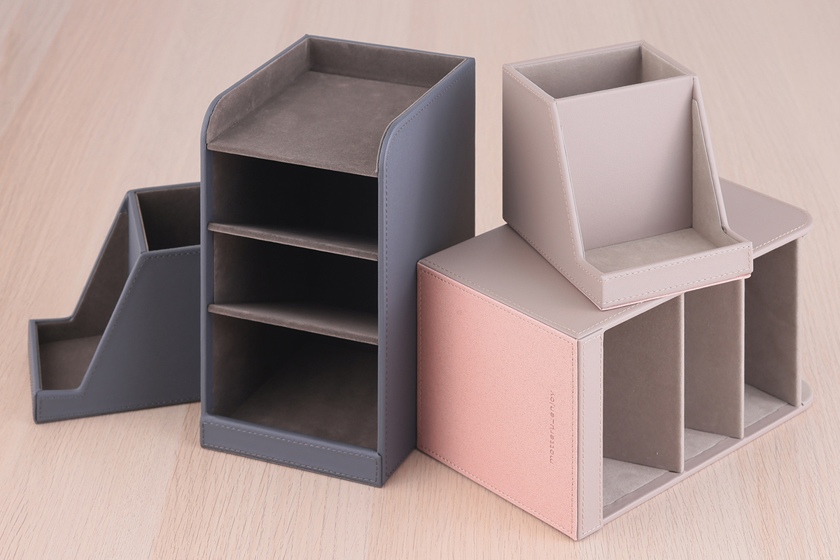 一方のデスクオーガナイザーは、卓上に置いて文房具などを収納する用途に活用できます。斜めに仕切りが付いて筆記用具などを入れやすい大きいタイプと、スマホや小物を入れやすい小さいタイプのセットになっています。