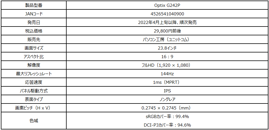 エムエスアイコンピュータージャパンは、4月上旬以降、ゲーミングモニターの新モデルを順次発売。コストパフォーマンスの良さが特徴のゲーミングモニターブランド「Optix G」シリーズより、「Optix G242P」を、パソコン工房(ユニットコム)限定で発売します。税込価格は2万9800円前後を予定しています。