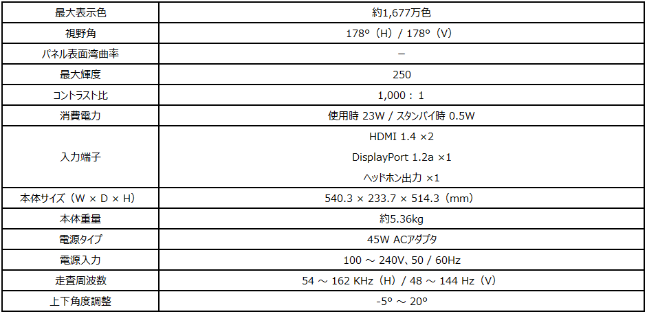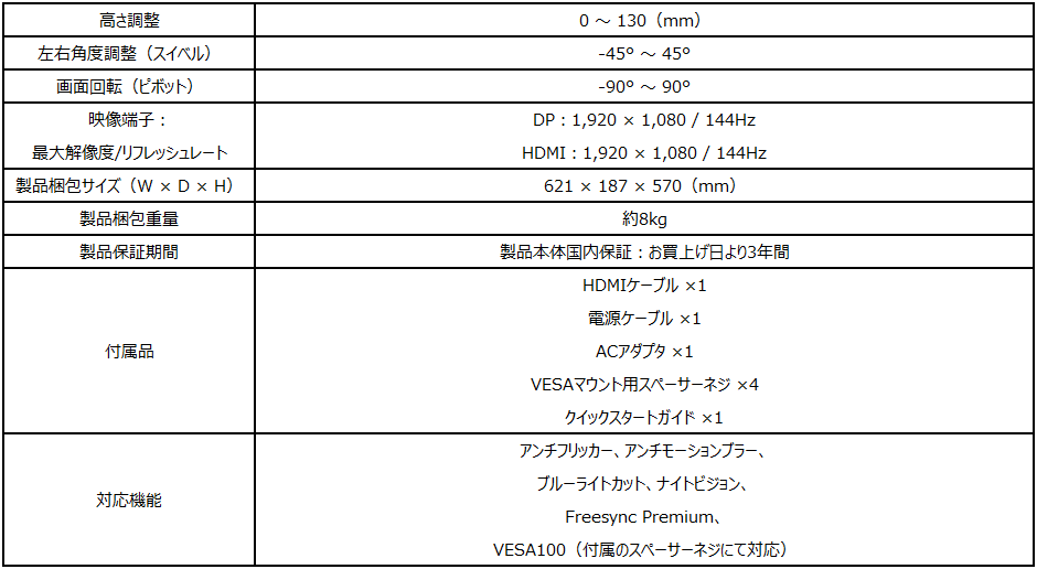 同製品は、23.8インチサイズに高画質・広視野角が特徴のIPSパネルを搭載し、144Hzのリフレッシュレートと1msの応答速度で、残像感の少ない映像で快適にゲームプレイを楽しむことができます。sRGBカバー率99.4%、DCI-P3カバー率94.6%の広色域にも対応しています。