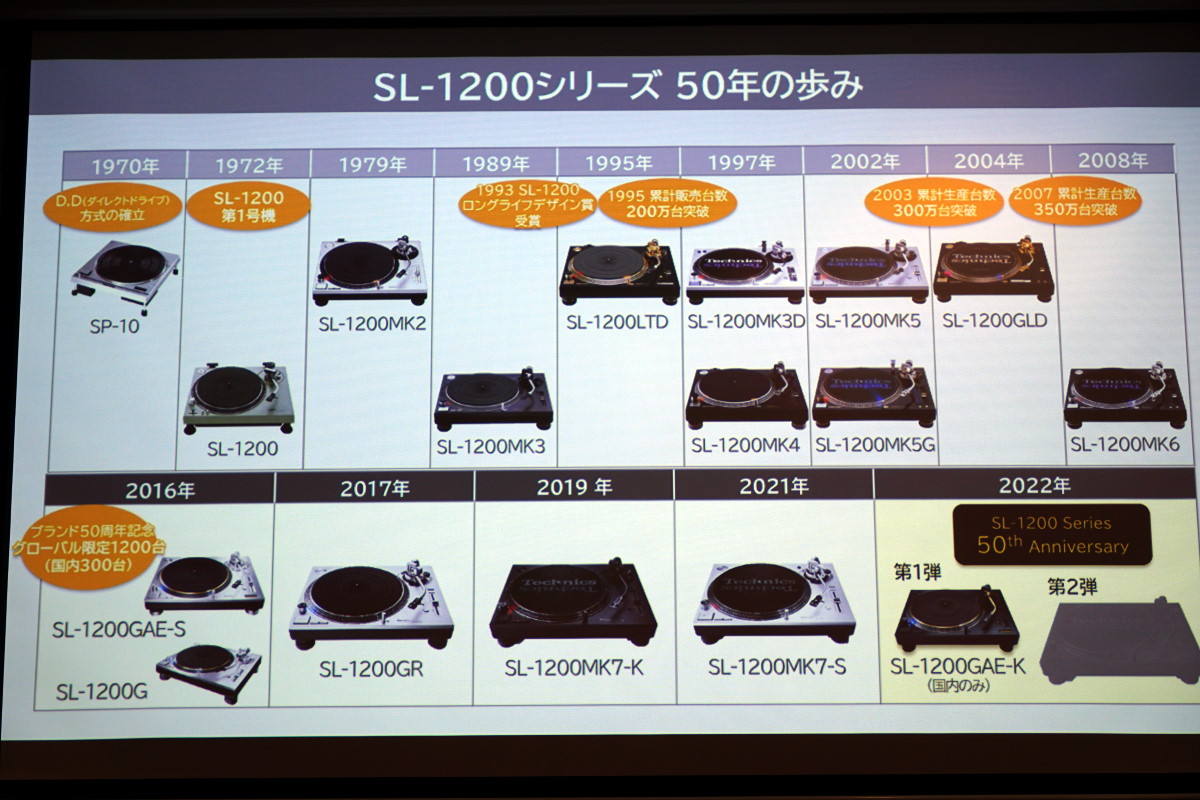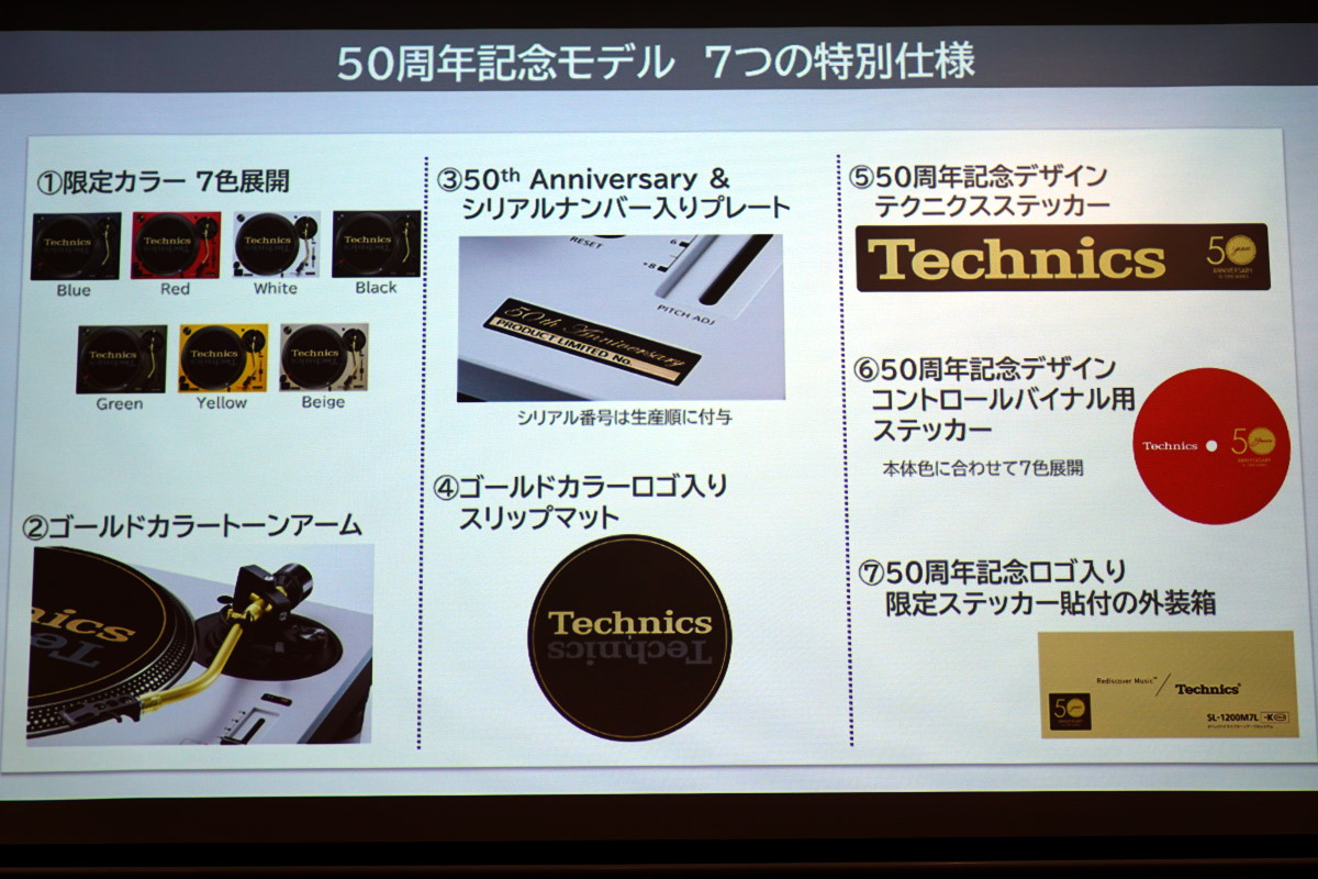このほか、トーンアームにはゴールドカラーを採用したほか、トップパネルには記念モデルを表す「50th Anniversary」の銘とシリアルナンバーを刻印したプレートを搭載。また、ゴールドカラーロゴ入りのスリップマットなど、付属品も特別仕様となっています。