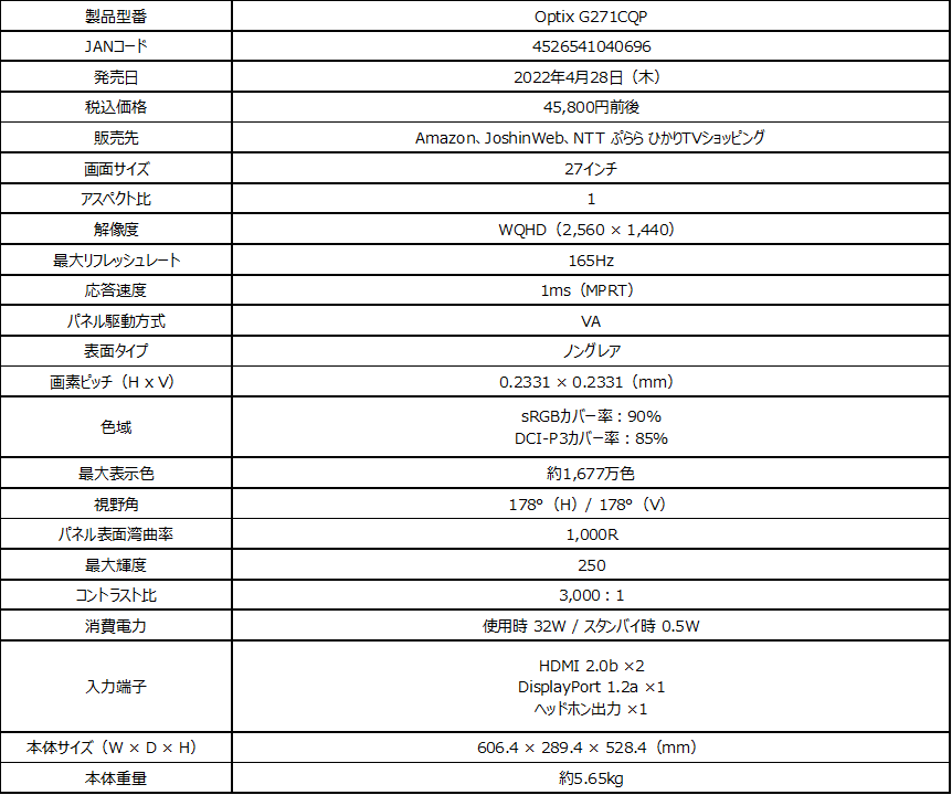 エムエスアイコンピュータージャパンは、コストパフォーマンス重視のゲーミングモニターブランド「Optix G」シリーズから、湾曲率1000RのWQHD(2560×1440)パネルを搭載したゲーミングモニター「Optix G271CQP」を、4月28日に発表します。価格は4万5800円前後。