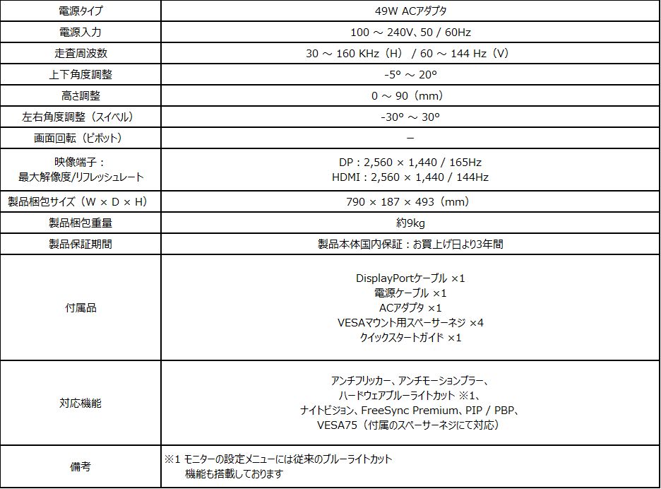 同期機能としてFreesync Premium、暗いシーンでも視認性を上げるナイトビジョン、発色を損なうことなく目の疲れを軽減可能なハードウェアブルーライト、画面のチラつきを抑えるアンチフリッカー機能を搭載。エルゴノミクスデザインを採用したスタンド機能により、無理のないポジションで使用でき、長時間の使用時でも、疲れを軽減します。入力端子はHDMI 2.0b×2、DisplayPort 1.2a×1に対応し、PCとゲーム機など複数の機器を接続する事が可能です。
