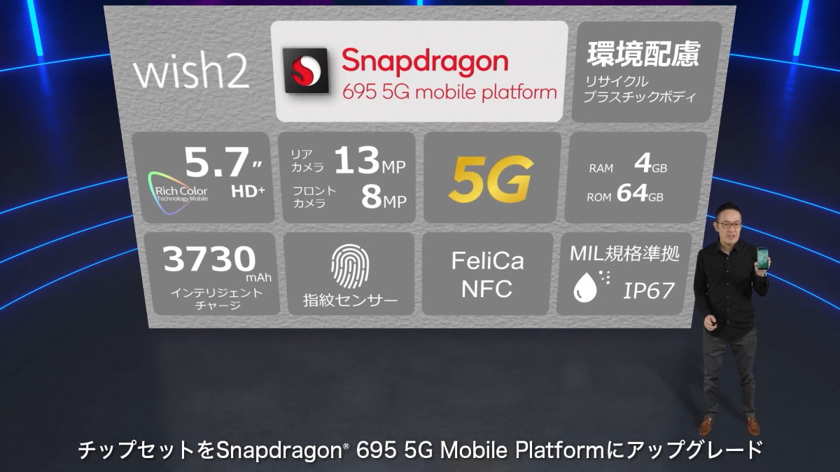 AQUOS wish2は、初代wishの外観や機能はそのままに、チップセットを Snapdragon 480 5Gから「Snapdragon 695 5G」へと変更。処理性能が約10%アップしたとしています。基本的な機能は初代wishと共通で、5.7インチの液晶ディスプレイや、1300万画素のメインカメラ、おサイフケータイ、指紋認証などを搭載。MIL規格に準拠した高レベルな防水・防塵性能も備えています。