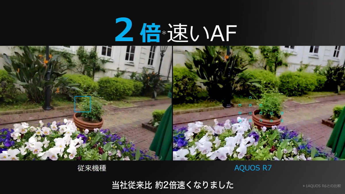 どれだけ暗い場所で撮影できるかの目安となる集光量は、前世代モデル比で約1.8倍向上しており、オートフォーカスの速度が約2倍に高速化しています。ただし、前世代のAQUOS R6はスマホとしてはフォーカス速度が遅い傾向があったため、弱点が解消されたということになりそうです。