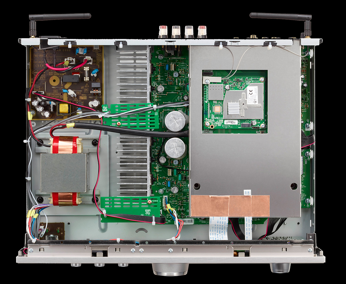 「PMA-900HNE」は従来のパワーアンプにボリュームを付けたというシンプルな構成を改めて、上級機の「PMA-A110」と同じ2段構成にすることで、小音量再生時の雑音を減少させているそう。さらにアナログ方式だったボリュームも、左右で音量差のない新型電子ボリュームに変更して、信号経路の短縮化も実現しました。