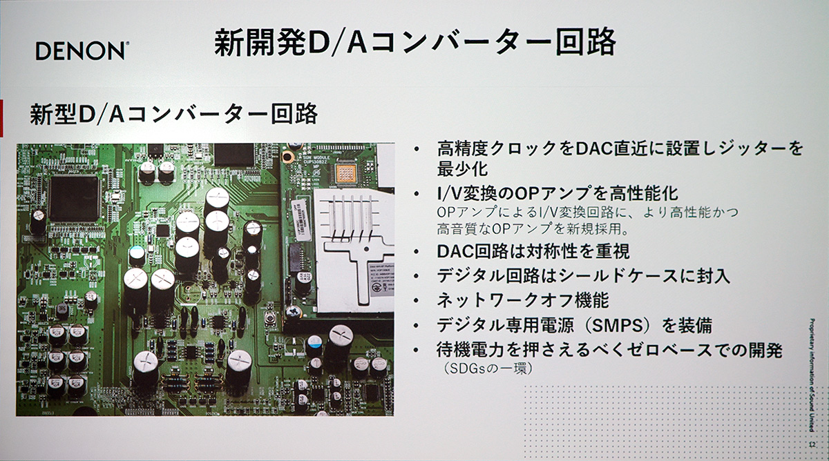 デジタル音源の音質の決め手となるDACも新開発され、回路全体を制御するクロックをDACの間近に配置することでデジタルノイズを抑えています。また、デジタル回路全体をシールドケースに収めてアナログ回路への悪影響を防ぎ、デジタル専用電源の採用により、電源回路もアナログとデジタルで分離されています。
