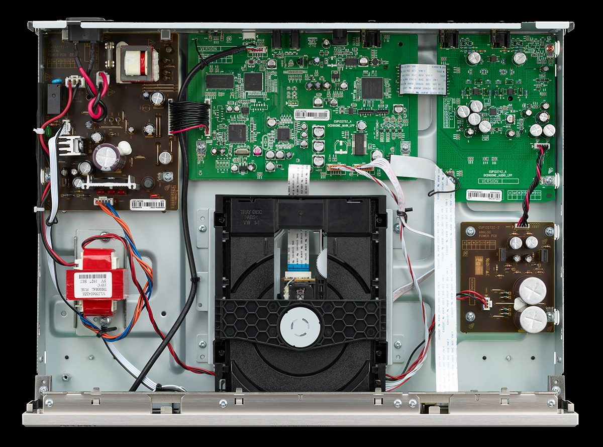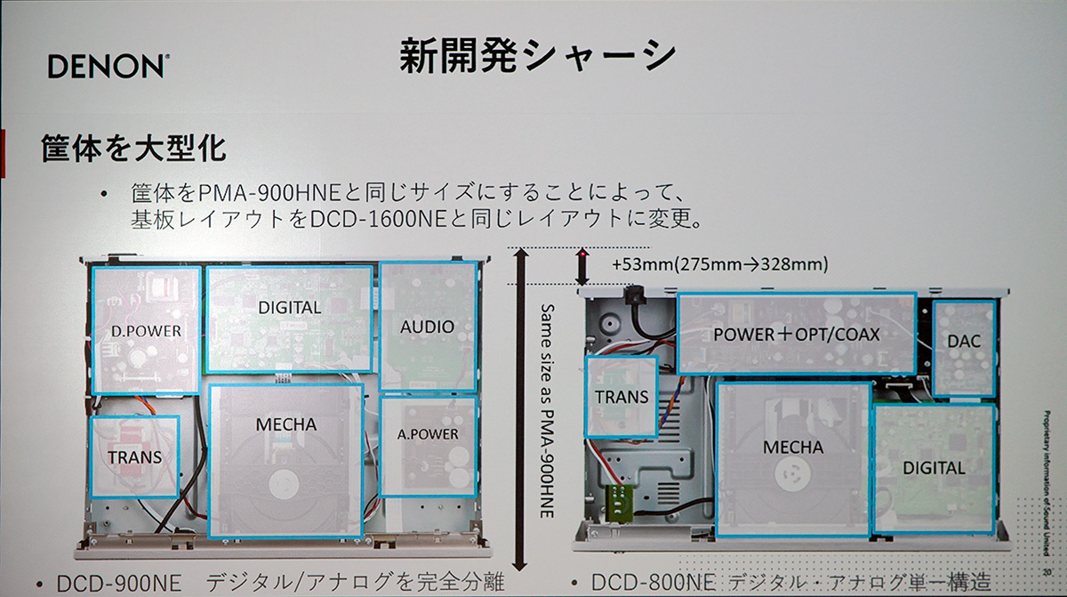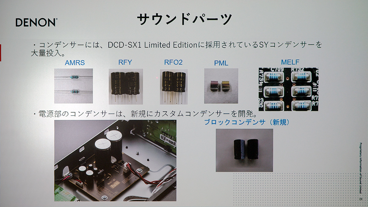 CPプレーヤー「DCD-900NE」は、時代を逆行するかのように上位モデルの「DCD-1600NE」と同じサイズの筐体を採用しました。これによって、デジタル部とアナログ部を完全分離し、お互いの悪影響を抑えているそうです。アンプと同様に新開発のDACを搭載して、USBメモリーなどに保存したハイレゾ音源の再生も可能。また、ハイエンドモデルに使われている高音質パーツ「SYコンデンサー」を大量投入するなどして、音質強化を図っています。