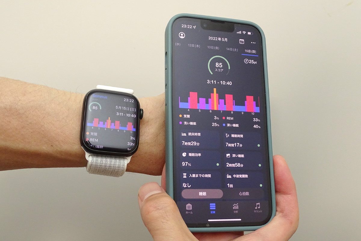 まずはスマホにインストールして、無料で使えるモバイルアプリから睡眠トラッキングを試してみる手もあります。例えばiOS/Android対応のアプリ「Somnus」は、無料で使える睡眠計測・目覚ましアラームアプリです。スマホを枕元に置いて寝ると、アプリがユーザーの睡眠データを自動的に取得します。アラームを設定した時間が近づいたときに、一番眠りが浅くなったタイミングを見計らって目覚ましを鳴らしてくれるので、シャキッと爽快な寝覚めが実感できます。iOS版はApple Watchにも対応しています。