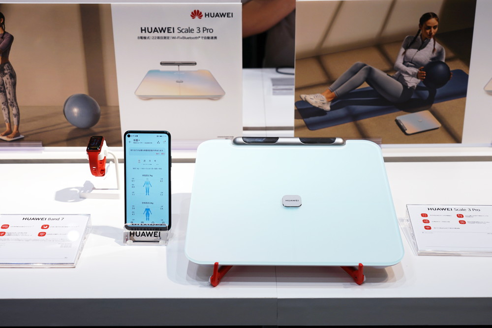 スマホと組み合わせて使うヘルスケア製品のジャンルでは、スマート体組成計「HUAWEI Scale 3 Pro」、スマートウォッチ「HUAWEI WATCH FIT 2」、スマートバンド「HUAWEI Band 7」の3製品が発表されました。3製品はいずれも、iPhone/Android向けアプリ「HUAWEI Health」アプリと連携して、心拍数や歩数、体重などを記録します。