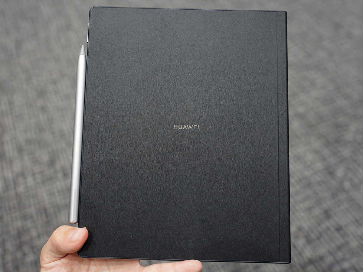 背面は合皮製で、見た目はいかにもビジネスツールといった風合い。マグネット装着式の専用カバー(同梱)をカチャッと装着した様子は、大判のビジネス手帳か豪華な装丁本のようにも見えます。付属のHUAWEI M-Pencil(第2世代)は、本体にマグネットで取り付けて一緒に持ち歩けます。
