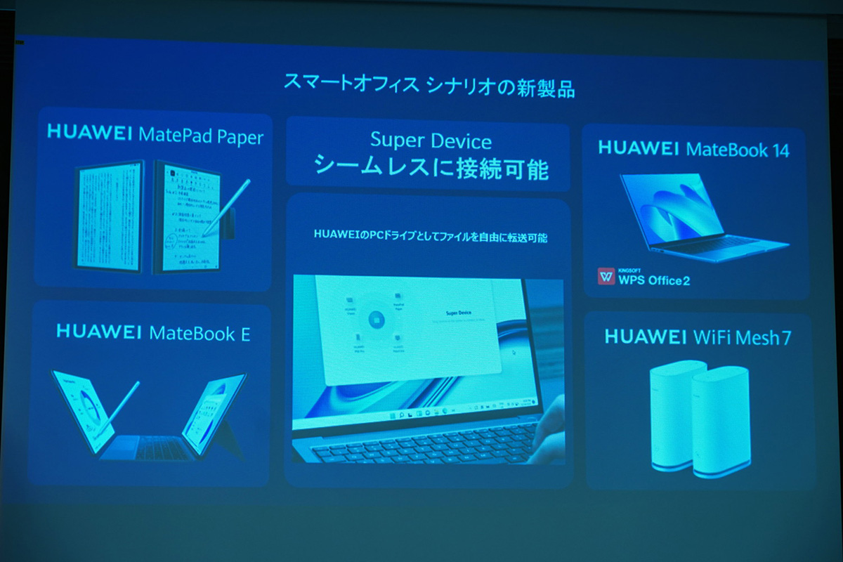 本記事では新製品9製品のうち、HUAWEI MatePad Paperを含むPC関連の4製品をレポートします。なお、もう1つの目玉製品であるメガネ型のスピーカー「HUAWEI Eyewear」については、以下の記事をご覧ください。