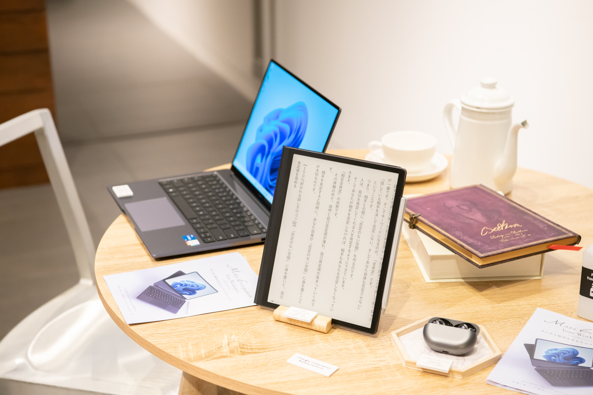 また、カフェでの読書を想起してもらうために、HUAWEI MatePad Paperを置き、電子書籍のよさや、メモの書き心地などを体感できる場に仕上げました。