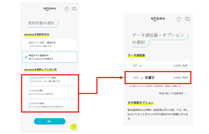 ahamo大盛りは、ahamoの契約に、月額1980円(税込)の「大盛りオプション」を追加することで、テザリングを含む計100GBのデータ通信を利用できます。