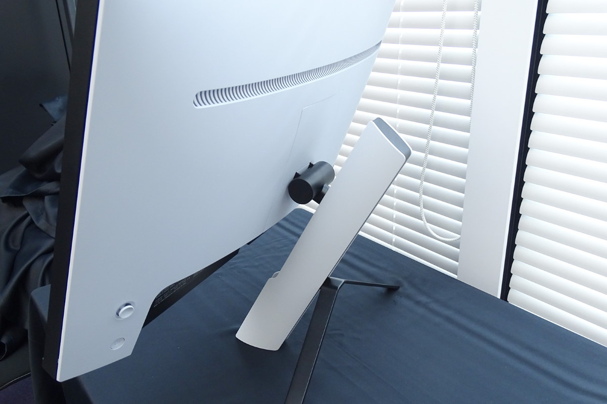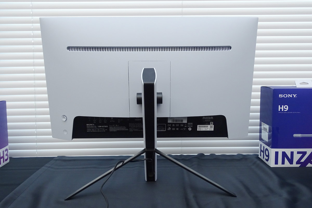 INZONEのモニター本体はホワイトを基調に、ブラックをコンビにしたツートーンカラーとしています。どことなくPlayStation 5のデザインに近い雰囲気です。本体背面のスリットにはLEDが内蔵されていて、INZONEのテーマカラーである「パープル」のほか、様々な色に点灯します。