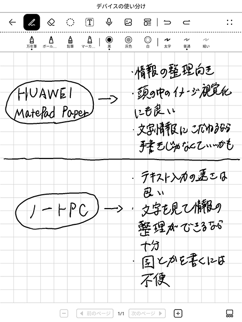 そこで、資料や企画書作りはPC、そこに至るまでの、まだ輪郭が明確でないアイデアやネタをラフに書き留めたり、ビジネスに役立ちそうな情報をメモ書き状態でストックしたりするのはHUAWEI MatePad Paperと役割を決めました。