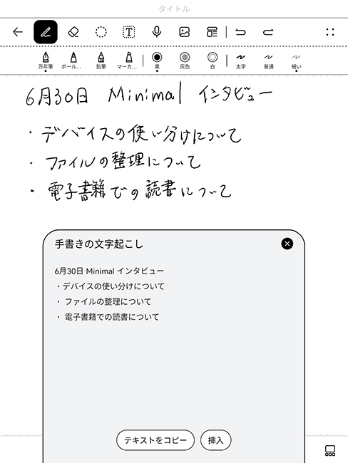HUAWEI MatePad Paperのメモアプリは、手書きの情報をテキストファイルに変換できます。たとえば、「6月30日 Minimal」とテキストで見出しをつけておけば、デバイスの検索窓から「6月30日」や「Minimal」と調べるだけで、そのテキスト情報を含むファイルがすぐに表示されます。