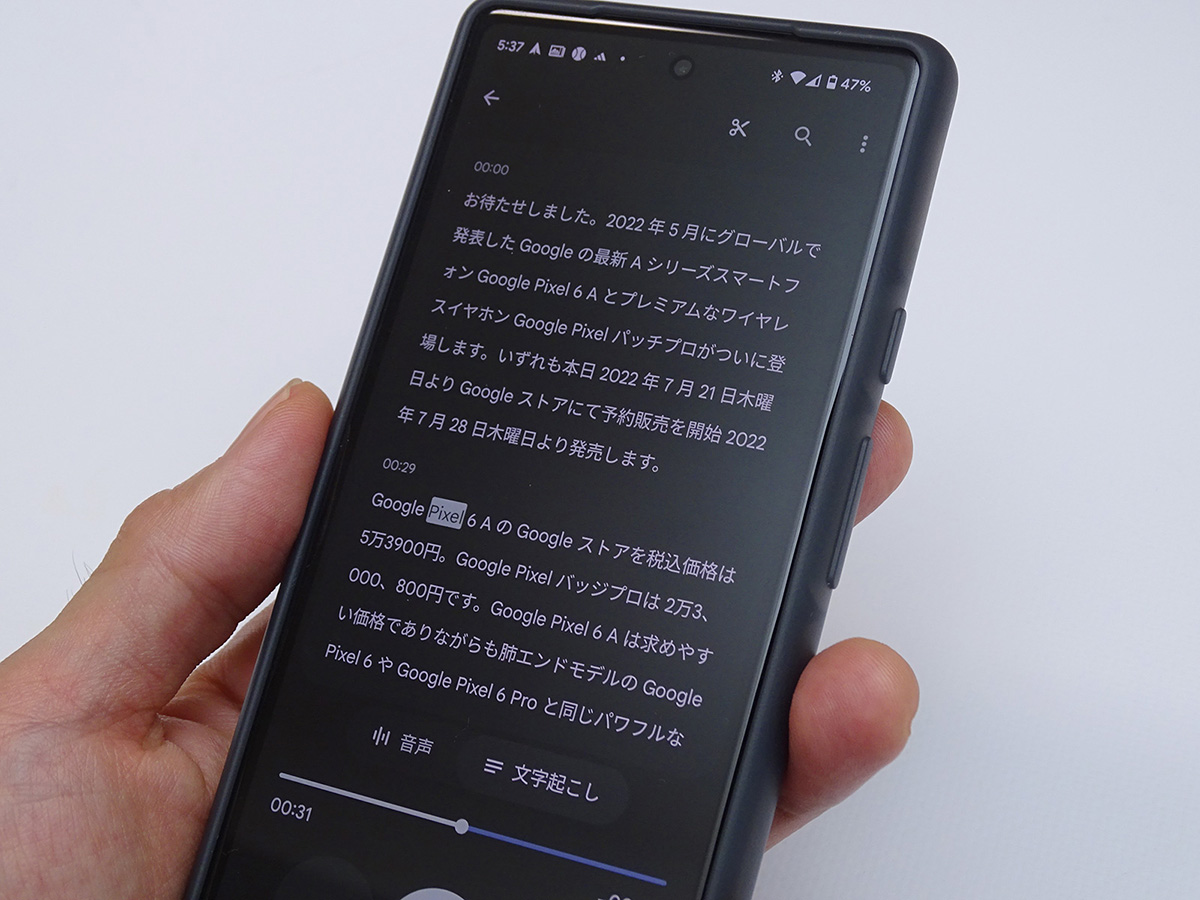 例えば筆者は、精度の高い音声文字起こしができる、Pixelシリーズの純正アプリ「レコーダー」を仕事でもよく活用しています。Google Pixel 6aは本体のサイズがGoogle Pixel 6 Proに比べてコンパクトになり、片手で持ちながら軽快に操作ができます。そのため、必要なときにはすぐバッグやポケットから取り出せますし、スマホを手に構えて立ったままインタビューの音声メモを録るのも楽になりました。