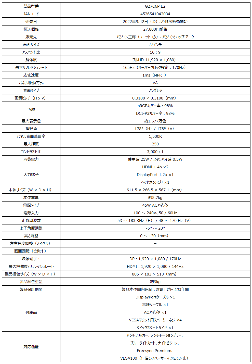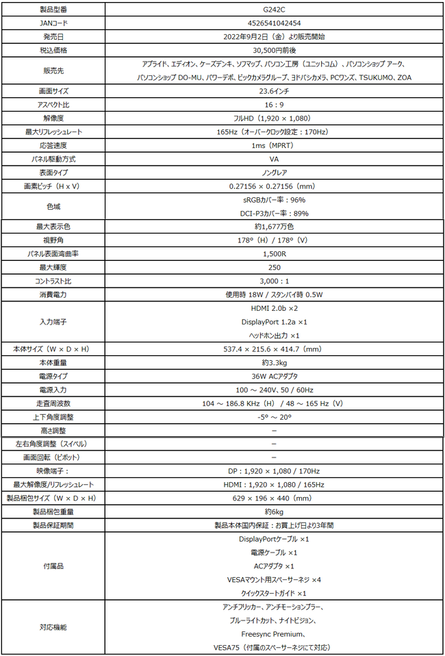税込価格は、G2722が3万2800円前後、G242Cが3万500円前後、G27C6P E2が2万7800円前後。スペックの詳細は、以下のギャラリーをご覧ください(画像をタップすると閲覧できます)。