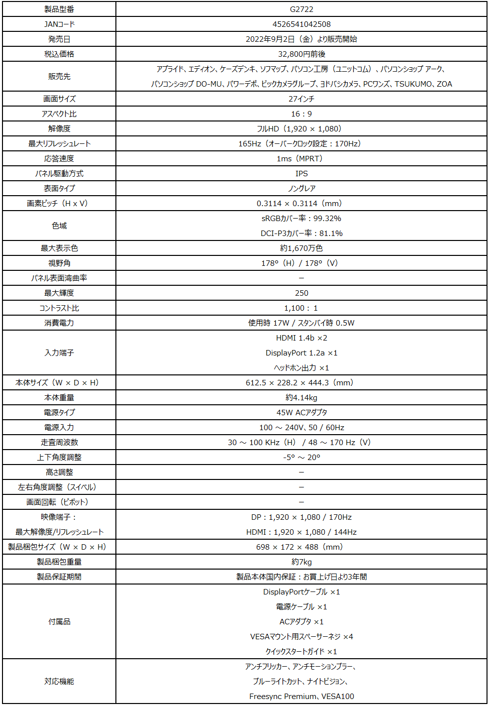 3モデル共通で、同期機能としてFreeSync Premium、暗いシーンでも視認性を上げるナイトビジョン、長時間使用時に目の疲労を軽減するアンチフリッカー、ブルーライトカット機能を搭載。VESA規格にも対応しており、付属のスペーサーネジを使用する事でモニターアームに取り付ける事が可能です。