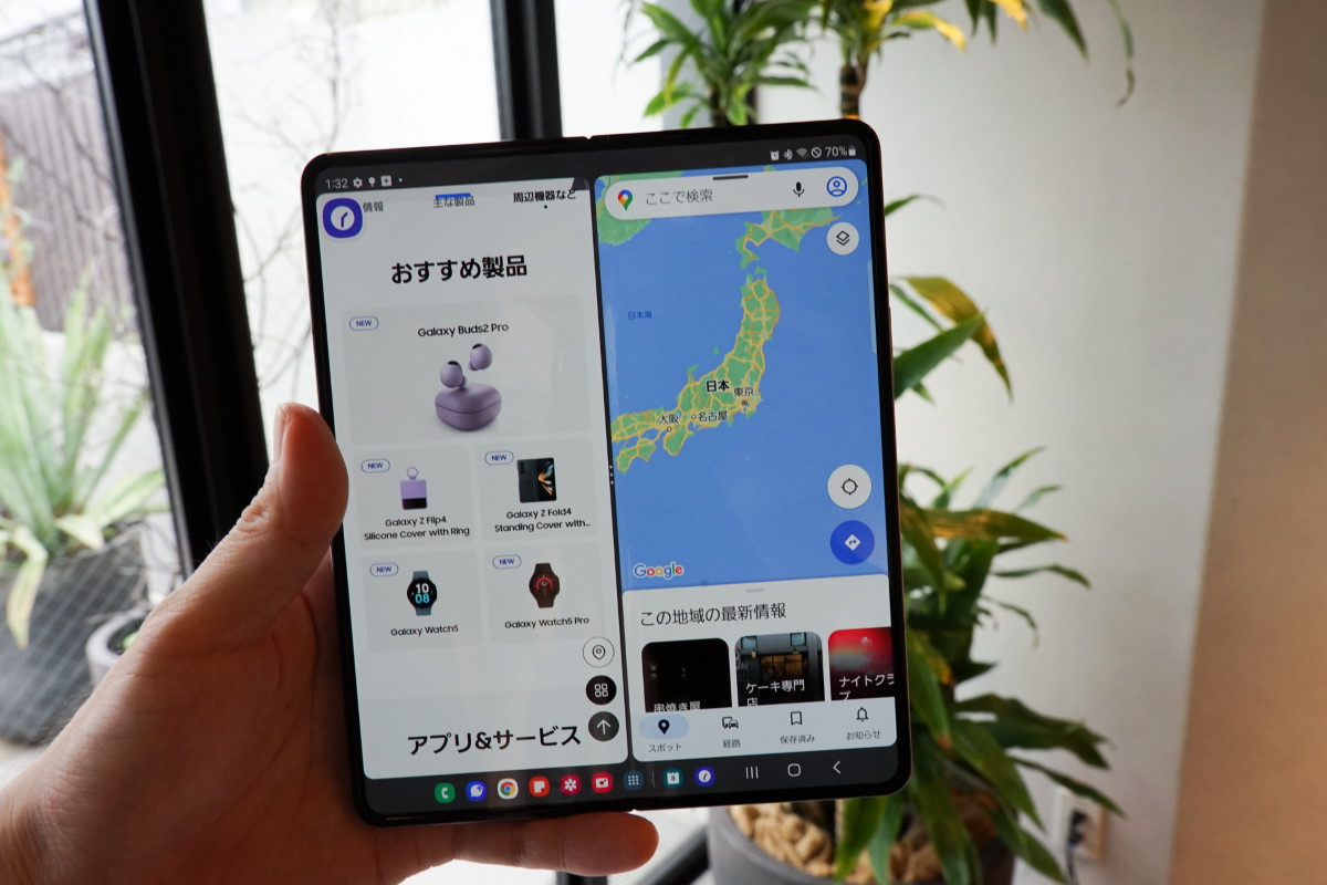 Galaxy Z Fold4の良いところは、スマホモードとタブレットモードの切り替えが非常に素早く行えることです。「スマホとタブレットの2台持ち」でもマルチタスク作業はできますが、Galaxy Z Fold4なら普段はスマホとして使いつつ、必要な時に大画面に移って、開いているアプリをそのままで作業を継続できます。2台持ちでは工夫が必要なデータのやり取りも、そもそも1台のスマホで完結するため必要がありません。