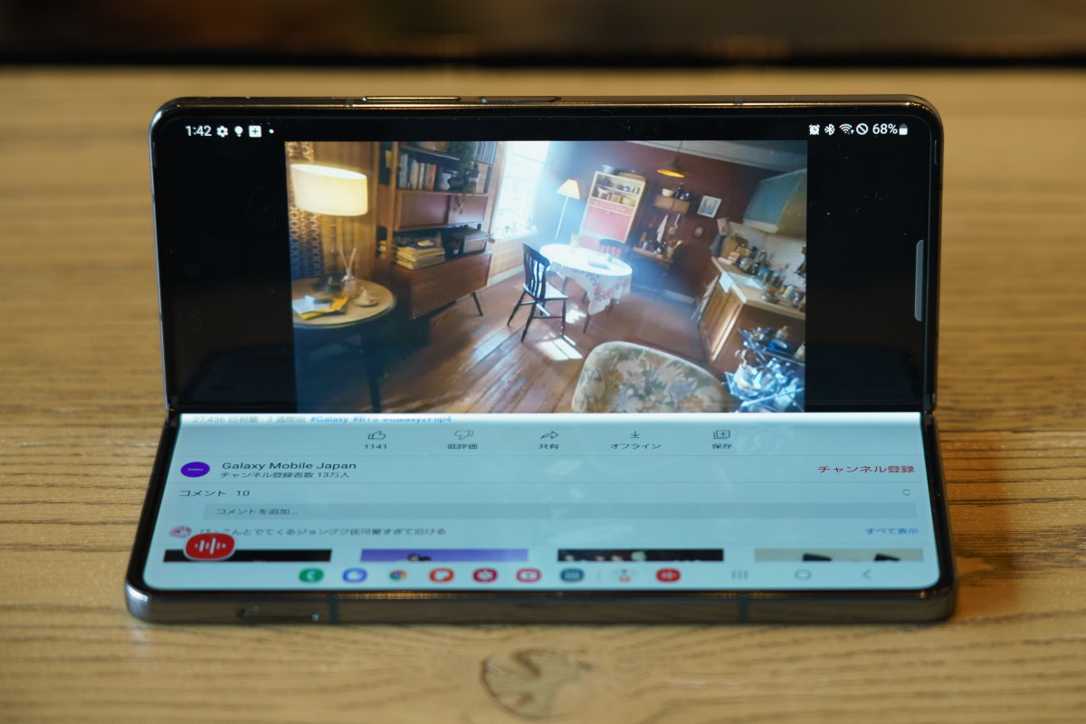 さらに、折りたたみスマホならではのユニークな使い方もできます。90度ほどの角度で折りたたんだ状態にすると、横長の2画面で使えます。例えば、上の半分でZoomなどのビデオ会議アプリを表示して、下の半分でメモを取るという使い方ができます。別売の「Sペン」を使うと、手書き入力でメモを取ったり、イメージ図をスケッチして残すこともできます。
