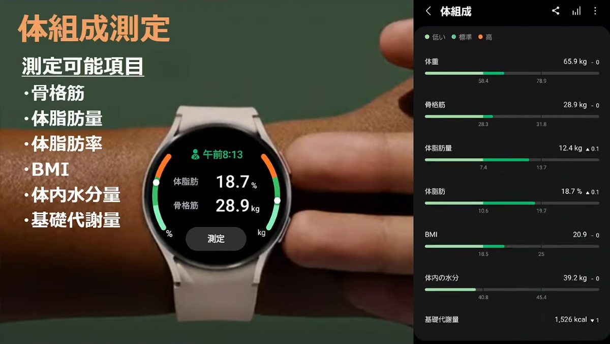健康づくりやフィットネスを助ける多数の機能を搭載しており、心拍数や睡眠状況、ストレスレベルなど記録に対応。Galaxy Watchならではの機能としては、指を当てるだけで体脂肪率などを計測する「体組成計」機能を備えています。
