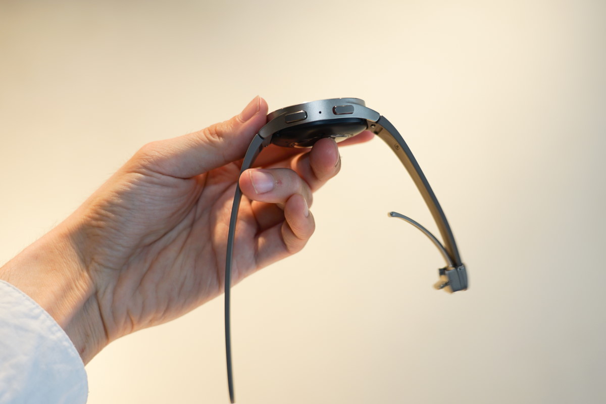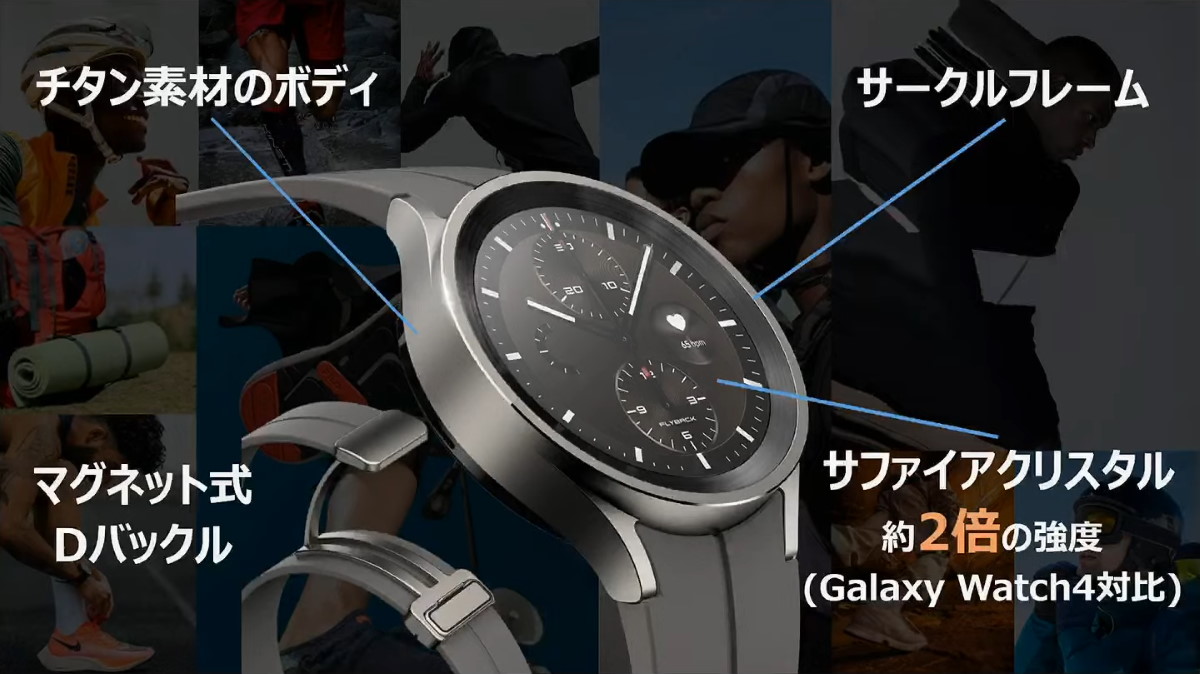 上位モデルの「Galaxy Watch5 Pro」は、チタン製の頑丈なケースとマグネット式のバックルを採用したタフなモデルです。GPS計測オンで20時間持続する大容量のバッテリーを搭載し、アウトドア活動でより使いやすくなっています。