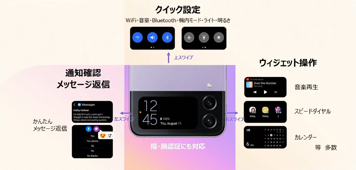 Galaxy Z Flip4には外側に小さなサブ画面がついており、待受画像や短い動画、GIFアニメーションなどを設定できます。この画面もタッチパネルで、通知を確認したり、簡単な文章を返信したりといった操作を閉じた状態で行えます。さらに、サブ画面からカメラ起動して、高画質な外側のカメラでセルフィー(自分撮り)をするという機能まで搭載。Galaxy Z Flip4ではポートレートモードもサブ画面からの起動に対応しているので、よりリッチなセルフィーができます。