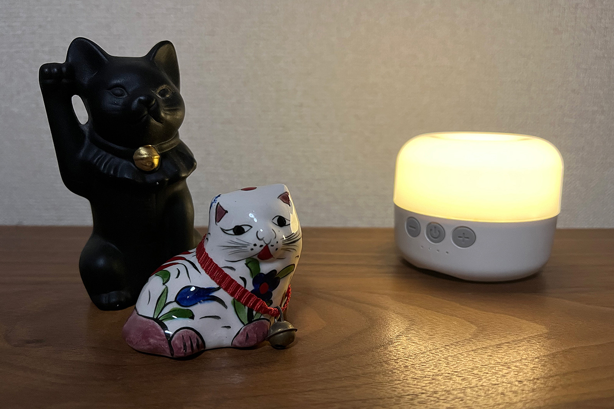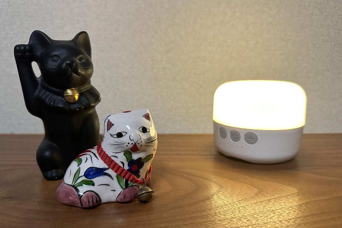 iPhone 14 Pro Maxの写真は、黒いマスコットの暗部をつぶさずにマットな質感をよく引き出しています。一方の白いマスコットは艶っぽさがとてもリアルです。また、ダイナミックレンジが広く、白いマスコットのホワイトや装飾の色がとても鮮やか。黒いマスコットが首にさげている鈴の金色がキラッと煌めく感じもきれいに再現できていると思います。照明器具の輪郭、テーブルの木目もシャープに描かれ、暗い場所でも立体感に富んだ写真を撮れました。