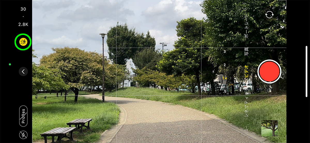 ビデオ撮影では、iPhone 14 Proシリーズから搭載される第2世代のセンサーシフト光学式手ぶれ補正がとても高い効果を発揮します。そして、より強力に手ぶれを抑えたい場面では「アクションモード」も便利です。カメラアプリでビデオ記録を選択すると、画面に“走る人”のピクトアイコンが表示されるのでこれをタップしてモードをオンにします。