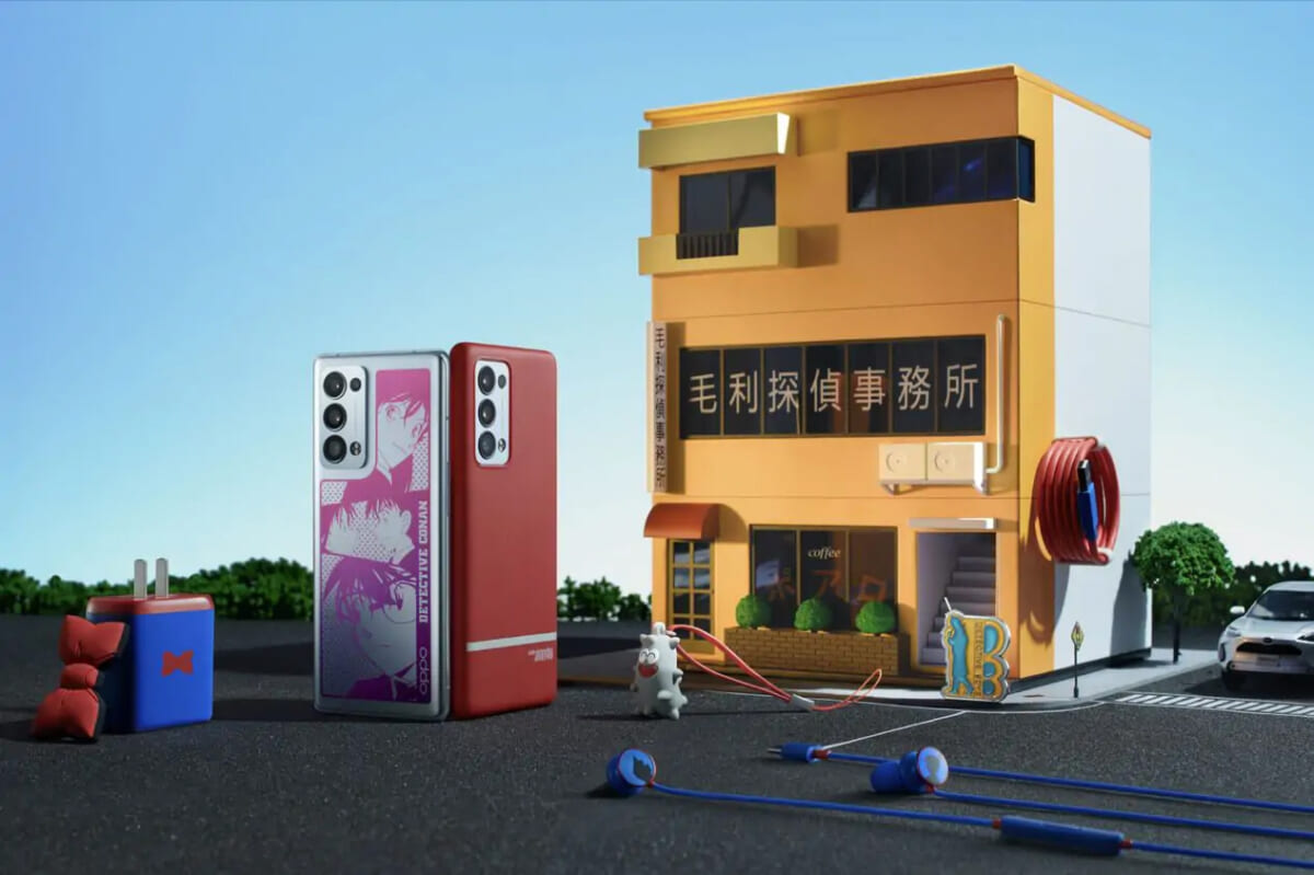 これはOPPOが2021年7月に発売した名探偵コナンのコラボモデル「OPPO Reno6 Pro+ 5G 名探偵コナン限定版」。名探偵コナンに出てくる毛利小五郎探偵事務所そのものがスマートフォンのパッケージになっているのです。屋根を開けると中にはおせち料理のお重箱が重なっているような構造になっており、スマートフォン本体の箱とアクセサリが入った箱、続いてアクセサリの箱も出てきます。アクセサリはコナンを知っている人なら「なるほどな」と思えるデザインのものばかり。