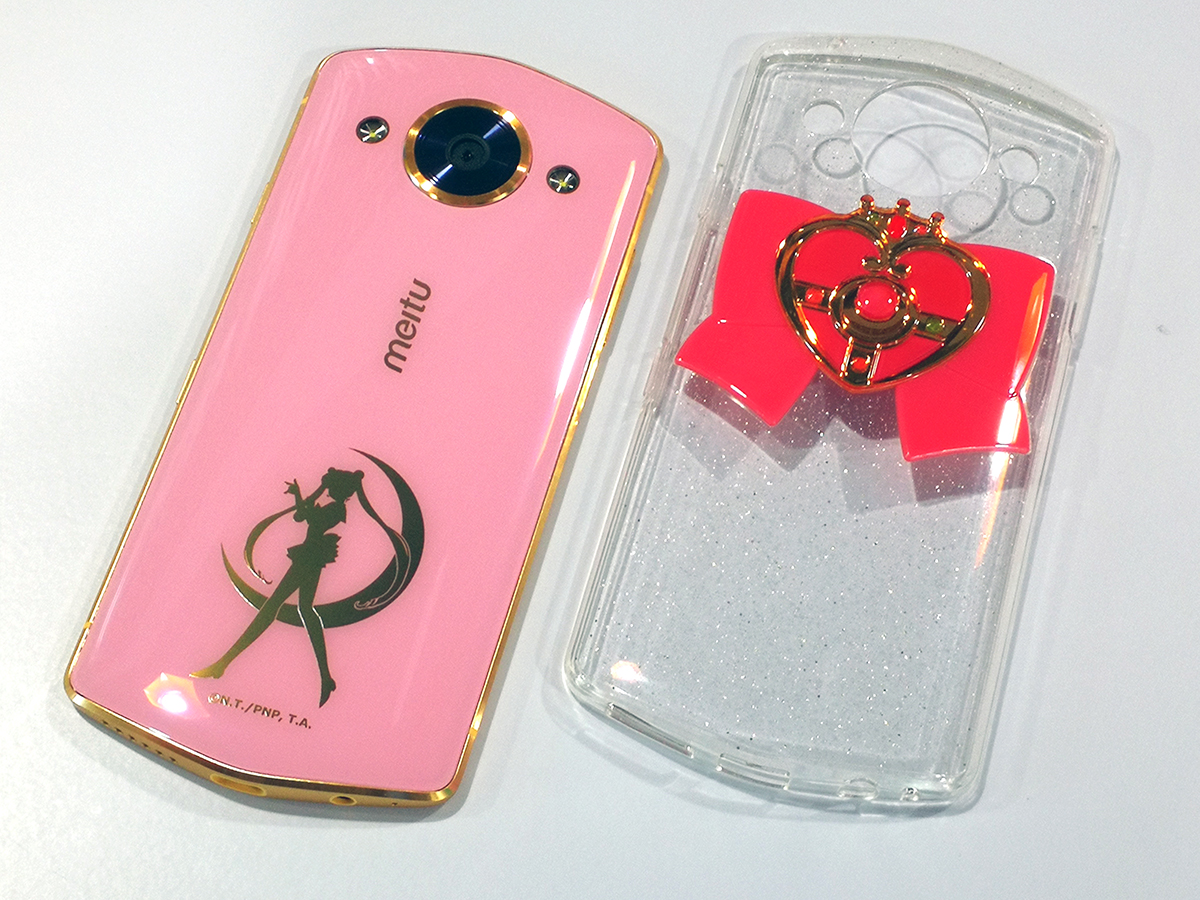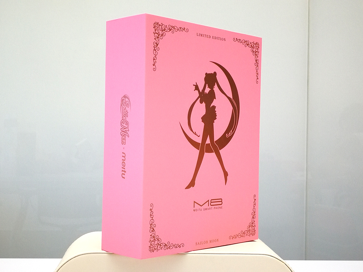 OPPOほどパッケージにこだわらなくとも、付属のアクセサリでキャラクターの世界観を明確にアピールしたスマートフォンも過去には出ていました。「自撮りスマホ」としてアジアで人気だったMeituが2017年に発売した「M8 セーラームーン限定版」です。パッケージはピンク色でセーラームーンのシルエットがゴールドで入っています。これを見るだけでもわくわくできる仕上げです。