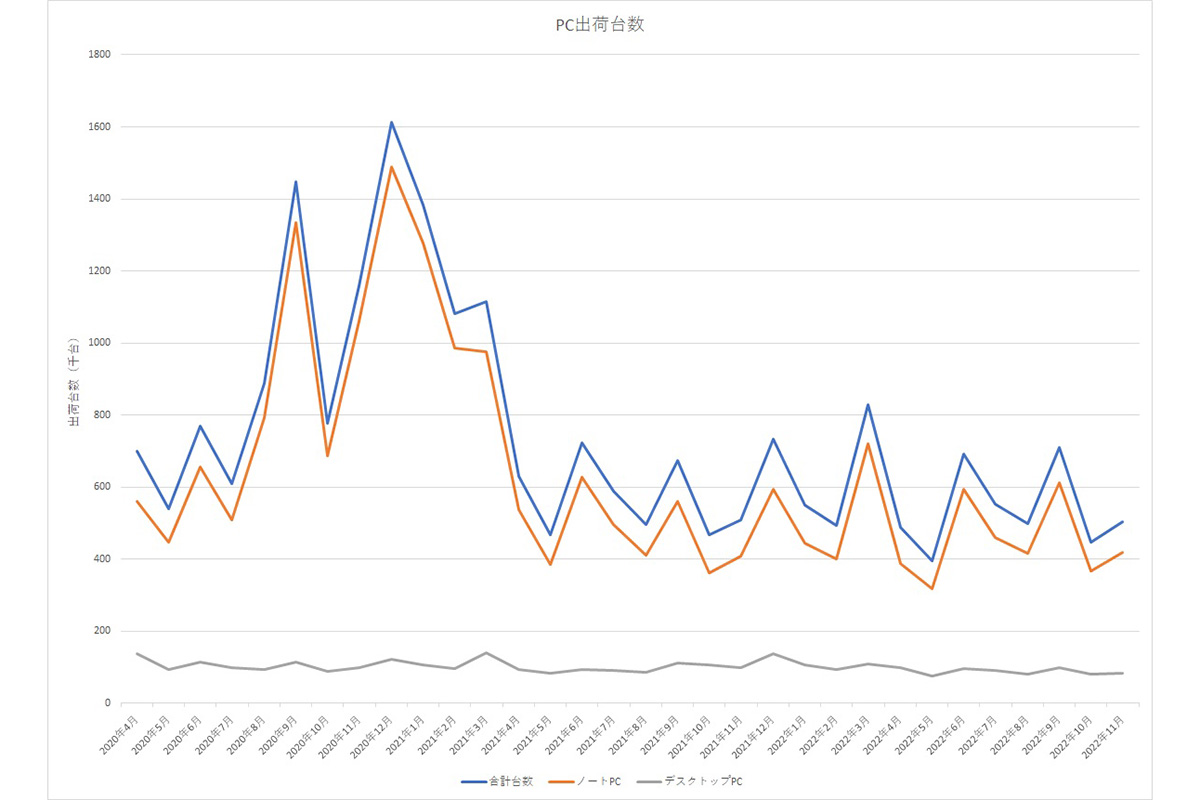 具体的にどんな動きがあったのか、JEITAが公開しているPC出荷台数の動きから、簡単に追ってみましょう。
