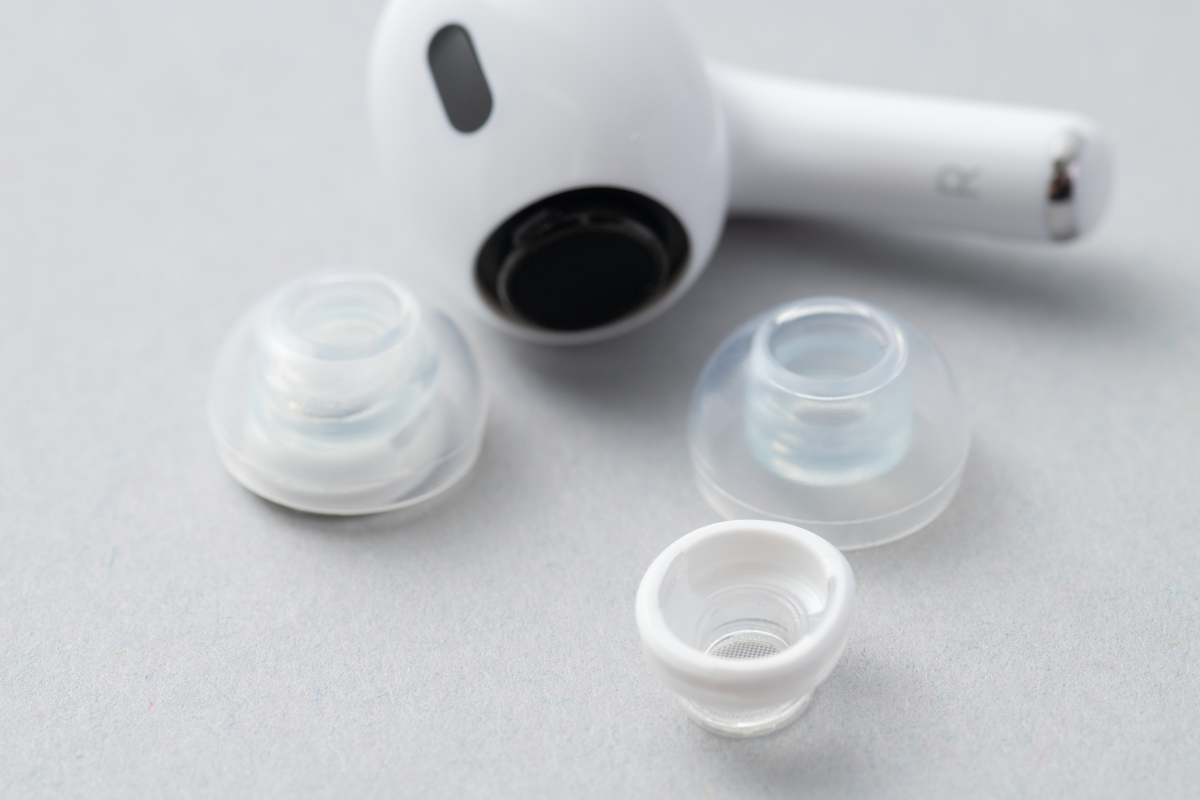そんな高性能なAirPods Proですが、使っている人に話を聞くと意外に多いのが「自分の耳になかなかフィットしない」「装着してるうちに外れてしまう」というもの。AirPods Proはカナル型(耳栓型)という方式を採用しており、開放型のノーマルAirPodsよりも耳への密着感と遮音性が高くなっています。その密着感と遮音性を支えているのがイヤーピースというパーツ。イヤホンの先端部分についているゴム栓のようなものですね。