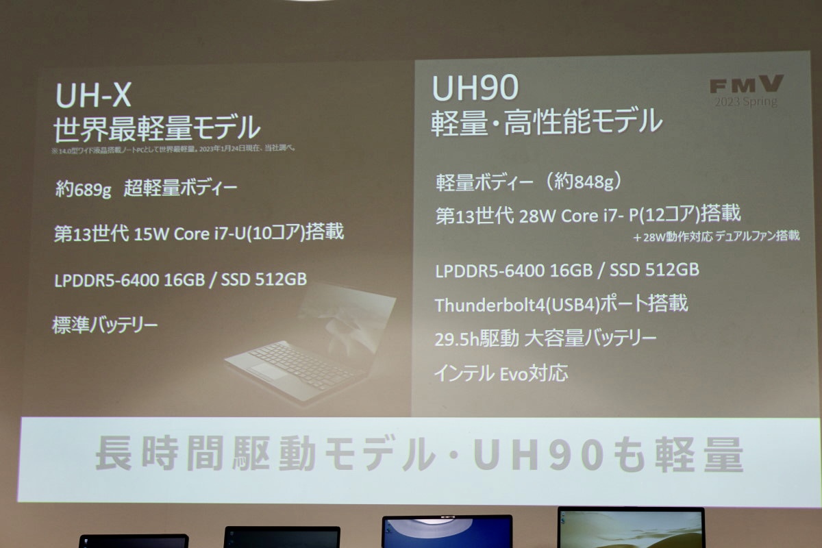 ラインナップは、14.0型サイズのモバイルノートPCとしては世界最軽量となる約689gの軽さを実現した「UH-X/H1」と、長時間使用できる大容量バッテリー搭載モデル「UH90/H1」、直販サイト「WEB MART」専用のカスタムメイドモデルを用意します。