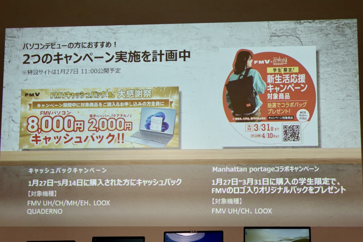 また、学生や新社会人の新生活を応援するキャンペーンとして、2023年1月27日から対象のFMVパソコン購入者向けにキャッシュバックやプレゼント企画を実施します。概要は以下の通り。