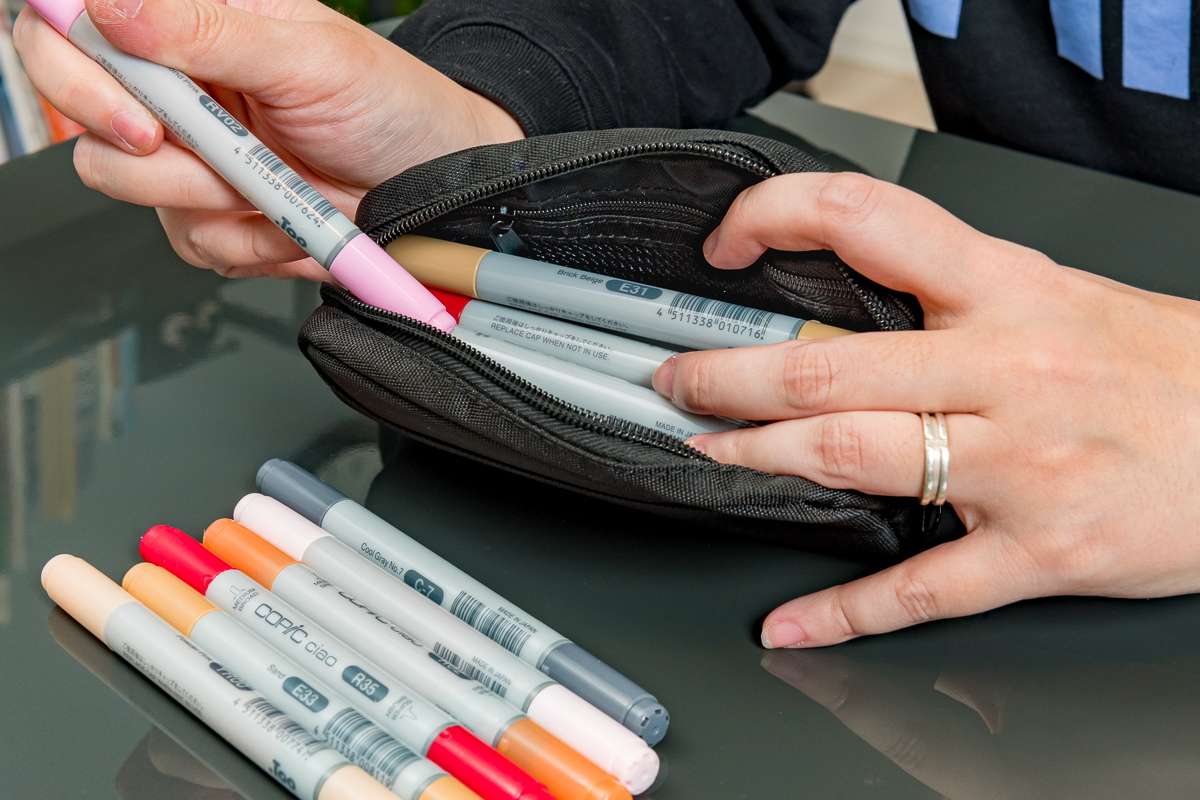 ちなみにSサイズはアルコールマーカー「コピック チャオ」が18本入るサイズ感です。