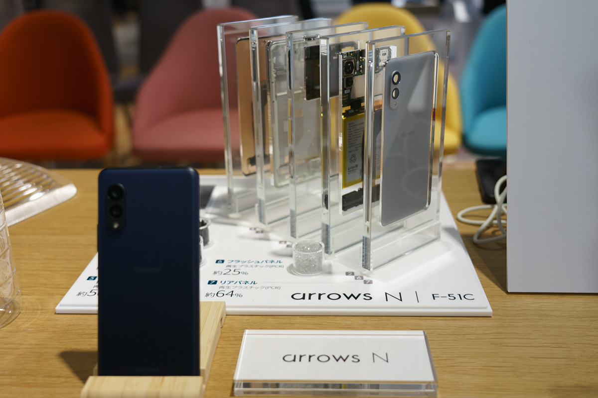 arrows N F-51Cは、スマホの外装やフレームで使われる素材のうち約67%に再生素材を採用。リサイクルされたペットボトルや、クルマのヘッドライトカバー、CDなどがスマホの筐体の過半数を占める部分に使われています。
