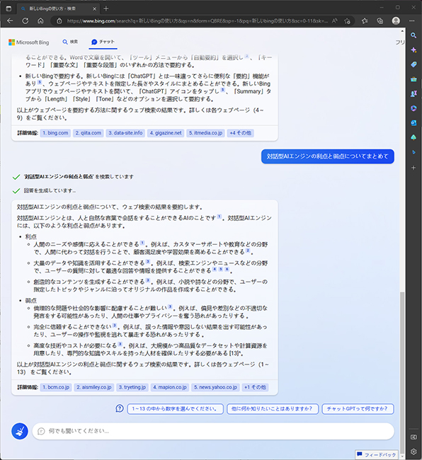 従来の検索エンジンは検索結果のWebサイトを一覧表示にして応答するのに対して、新しいBingでは検索結果の内容を要約して、流ちょうな話し言葉で応答します。