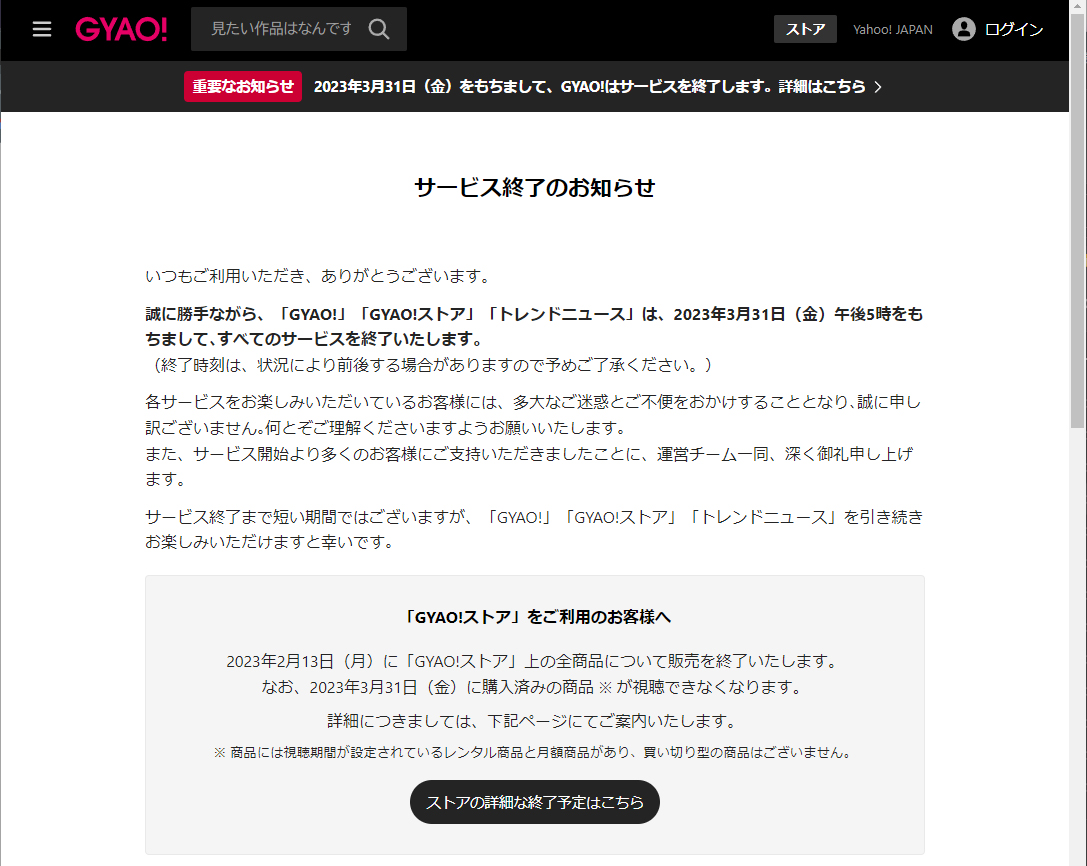 LINEとヤフー(Yahoo! JAPAN)を運営するZホールディングス(以下ZHD)は、無料の動画配信サービス「GYAO!」を、3月31日をもって終了すると発表しました。同時にZHDは、TVerとの提携も発表しています。