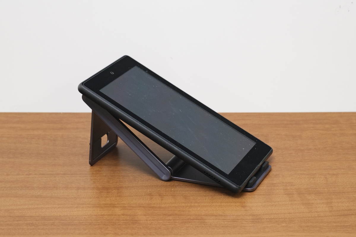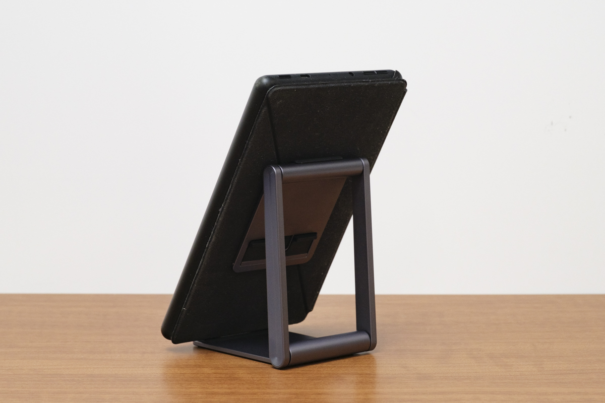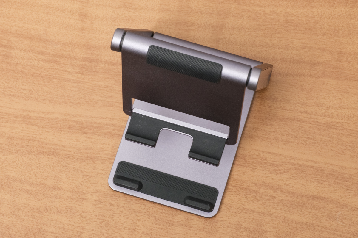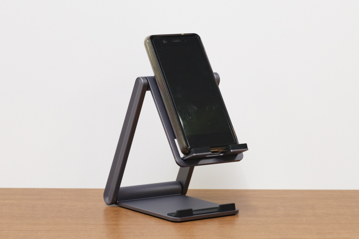 端末を設置する部分にはシリコンパッドが付いているので、バイブレーション通知などの振動で、端末とスタンドが擦れてキズが付くのを防いでいます。さらに、端末が滑りにくくなるので、安定感も増し増しです。