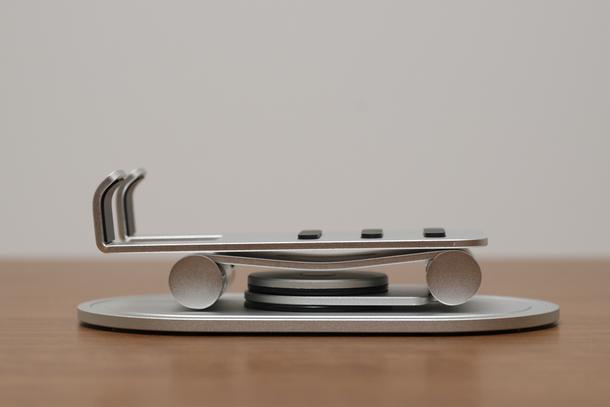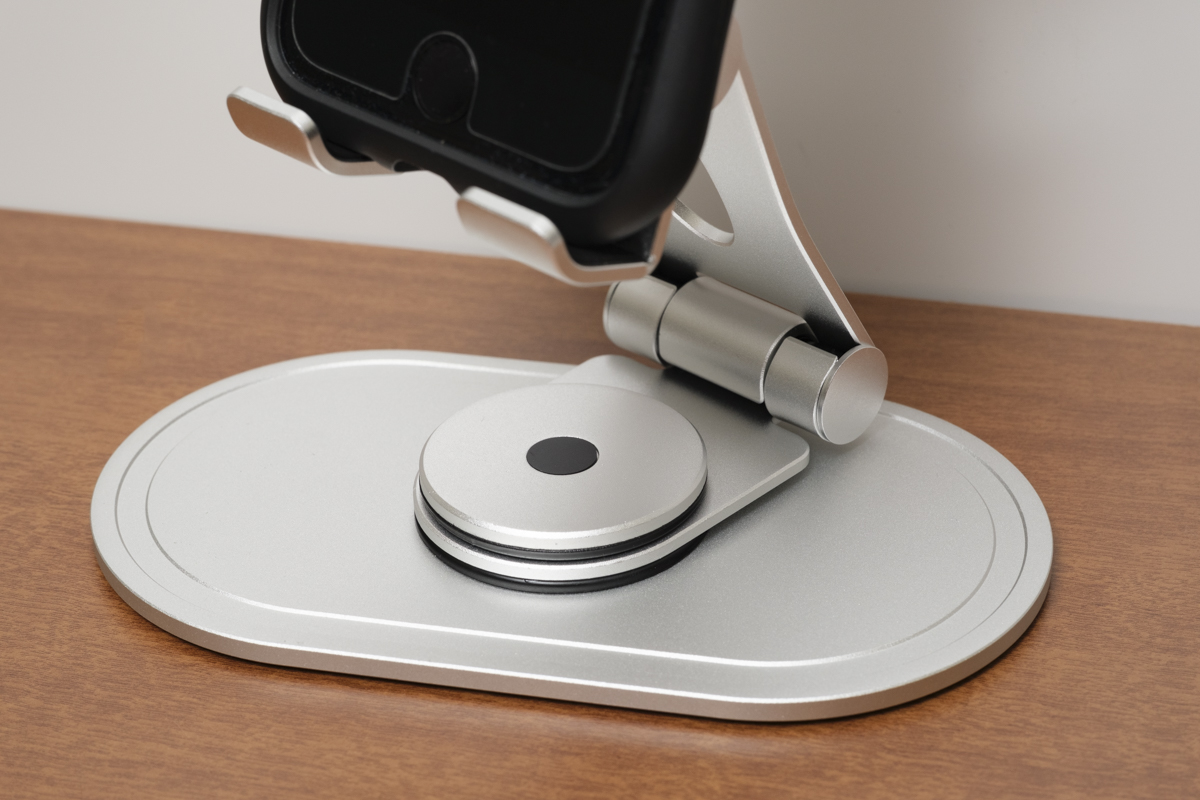 オウルテックから発売中の「OWL-STD11-SI」は、アルミニウム製のスマホ・タブレット用回転スタンド。台座が360度回転し、端末を載せたまま、見せたい向きに自由に回転させることができます。税込価格は3980円。